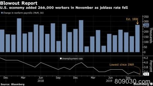 根据劳工部上周五发布的数据,11月份非农就业增加26.6万,超过接受彭博调查的所有经济学家预期,也是1月份以来最大增幅;10月份上修为增加15.6万。经济学家预期中值为增加18万。失业率跌至3.5%,追平1969年以来的最低水平。平均时薪同比成长3.1%,超出预期,并且上个月数据得到上修。