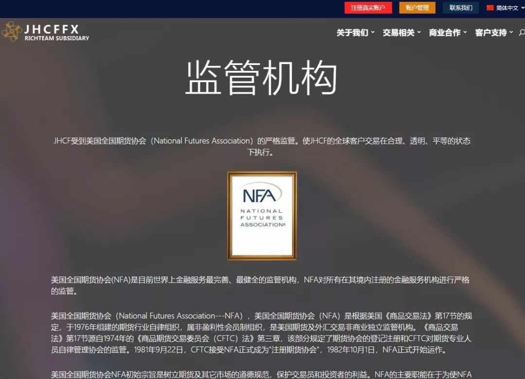 汇商君登入HKJKFX官网http://www.hkjhfx.com,发现其网站上名字已变更为JHCFFX,在监管信息上面声称受美国国家期货协会(NFA)监管,但未提供任何注册号以确认其监管状态。