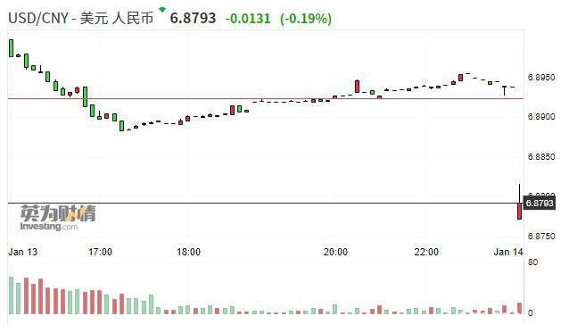 金融界网站1月14日讯 在岸人民币兑美元升破6.88关口,现报6.8776,日内涨超150点。