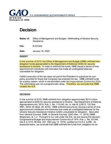 政府问责局的报告称,管理和预算办公室出于“出于政策原因”,扣留了国会拨给国防部用于向乌克兰提供安全援助的约2.14亿美元资金,这是截留控制法案(Impoungate Control Act)所不允许的。