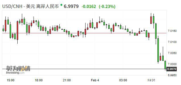 金融界网站2月4日讯 在岸人民币、离岸人民币双双升值收复7关口。在岸人民币日内涨超100点,现报6.9977;离岸人民币日内涨超200点,现报6.9979。
