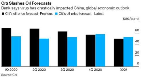 该行将第一季度布伦特原油价格预期从每桶69美元下调至每桶54美元。对未来两个季度的预测下调是基于疫情的影响将比此前预期的更长、更深。花旗认为,全球原油基准价格可能跌至每桶47美元,这将是两年半以来的最低水平。
