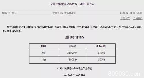 央行4日早间公告称,为充足供应流动性,维护疫情防控特殊时期银行体系流动性合理充裕,2020年2月4日人民银行以利率招标方式开展了5000亿元逆回购操作,包括3800亿元7天期、1200亿元14天期逆回购操作,操作利率分别为2.4%、2.55%,与前次相同。今日有1000亿元逆回购到期,因此央行实现净投放4000亿元。