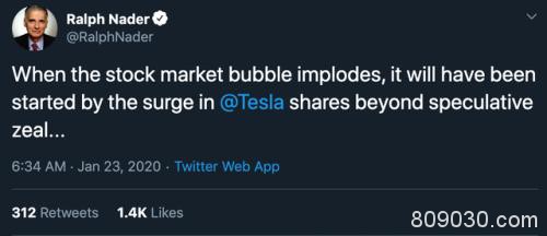 1月23日,纳德发表了一条推文称:“股票市场的泡沫破裂就是从特斯拉股票超出预期的暴涨开始的……”