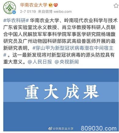 据华南农业大学官微消息,华南农业大学、岭南现代农业科学与技术广东省实验室沈永义教授、肖立华教授等科研人员联合中国人民解放军军事科学院军事医学研究院杨瑞馥研究员及广州动物园科研部陈武高级兽医师开展的最新研究表明,穿山甲为新型冠状病毒潜在中间宿主。这一最新发现将对新型冠状病毒的源头防控具有重大意义。