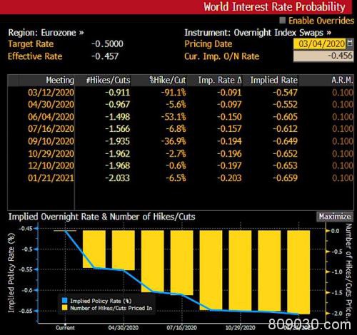 欧元区货币市场预计,欧洲央行有90%的可能性在下周将存款利率下调10个基点。目前欧洲央行的存款利率为负0.50%。
