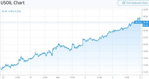 目前,布伦特原油期货已连续六天上涨,而美国原油期货连涨第五日。4月份全球燃料需求下降了约30%,但由于各国开始逐步解除旅行限制,需求正在小幅上升。一些欧洲和亚洲国家以及美国几个州开始放松疫情期间的封锁措施。