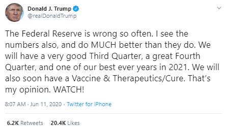 周四(6月11日)美国总统特朗普对美联储时隔数月发起了推特攻击,针对美联储的经济低迷的预测提出了质疑。在周四早间的推特上,特朗普写道:“美联储经常出错,我们将在第三和第四季度表现得非常好,2021年会是我们有史以来最好的一年。”