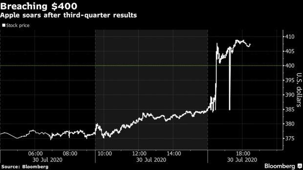 财报公布后,苹果公司股价盘后大涨逾6%。若涨幅延续至周五开盘将创史上最高,也是史上首次突破400美元整数位。