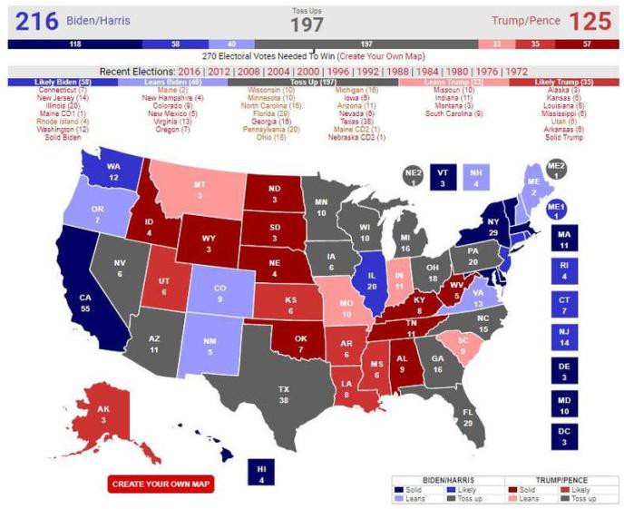 值得注意的是,如果民调像2016年那样错误,特朗普将赢得538张选举人票中的279张,而拜登将获得259张。