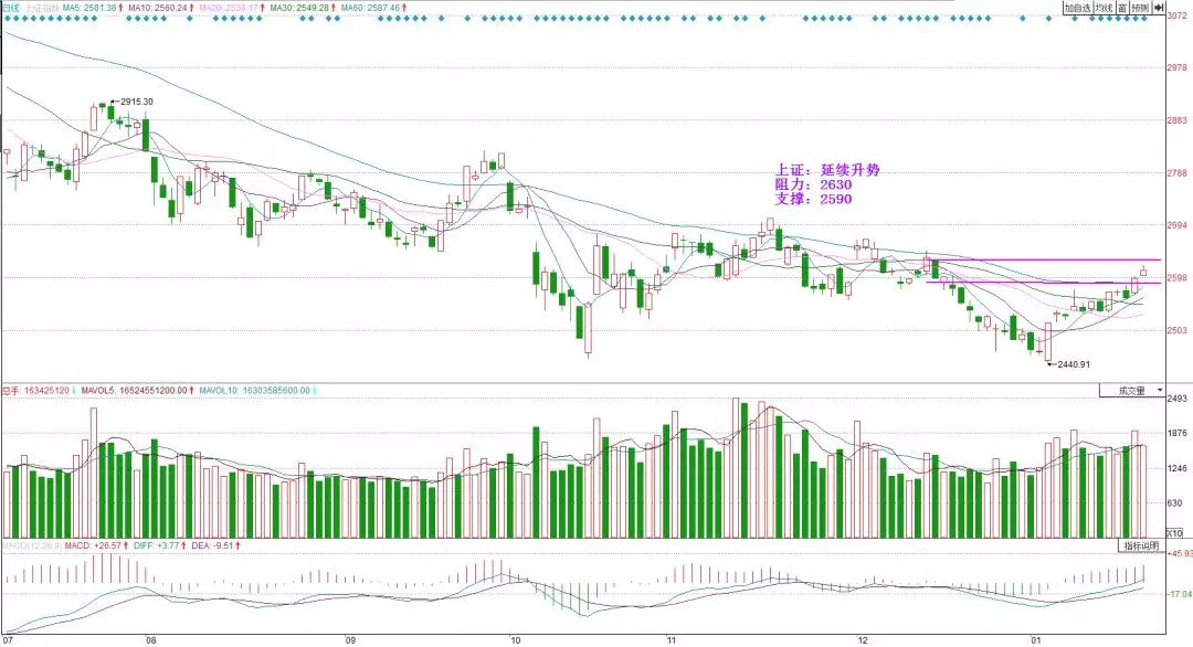 “ 三大股指承接上周五升势小幅高开,上证最高冲击至2618,逼近上周指出2620阻力位,午后出现震荡回落,但在2600上方止跌,即整体呈现2600-2618点的窄幅整理当中,延续上周升势日线收出小阳线,表现较为强势。近期以外资通过沪股通带领股指突破权重攻关,上周出现元旦后妖股纷纷退潮迹象,通产丽星风范股份等连续两日跌停,风格切换较为明显,应密切关注近期强势板块酒类与燃料电池等热点的持续性,耐心等待布局机会。