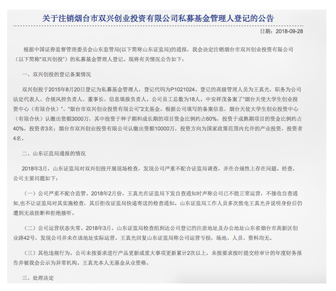 根据中基协公布的信息,汇融联创胶州分公司涉嫌非法开展理财活动,中安祥茂登记备案信息与实际情况严重不符、实际控制人被司法机关采取强制措施、公司目前无法正常经营。而根据山东证监局的通报,双兴创投严重不配合监管机构调查,并在合规性上存在问题,公司也无法正常经营。