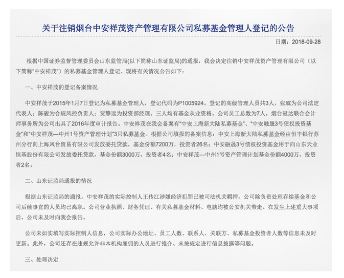 9月28日,中基协公布了对三家机构注销私募基金管理人登记的纪律处分结果。这三家机构分别是汇融联创投资管理(青岛)有限公司、烟台市双兴创业投资有限公司和烟台中安祥茂资产管理有限公司。