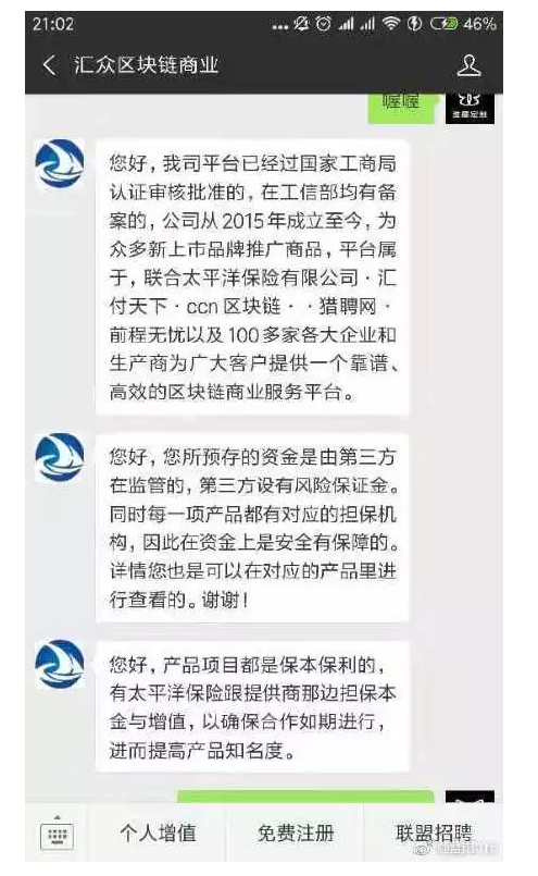 “其实,骗子平台上还有许多项目,并且会不断的推出新项目,不仅仅是官方公布的七个。”据受害者反映,汇众区块链是一个区块链项目投资平台,为众多新上市品牌推广商品,联合太平洋保险有限公司、汇付天下、CCN区块链、猎聘网、前程无忧以及100多家各大企业和生产商。