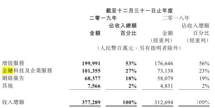 3月19日,腾讯控股有限公司(简称“腾讯”)公布2019年第四季度及2019年业绩报。2019年,腾讯收入同比增长21%至人民币3773亿元。其中,在几大业务板块中,金融科技板块增长最为强劲,并且成为唯一收入占比上升的板块。2019年,腾讯金融科技及企业服务收入1013.55亿元,相较于2018年的731.38亿元,增长约38.58%。另外,金融科技及企业服务收入在总收入中的占比从2018年的23%增至2019年的27%。