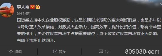今日,英大证券首席经济学家李大霄表示,国资委支持中央企业股权激励,这是长期以来期盼的重大利好消息,也是多年以来呼吁重大改革措施,对激发央企活力,提高效率,提升投资价值,都有非常重要的作用,央企在股票市场中占据重要地位,这个政策对股票市场有正面影响。有助于市场止跌回升。