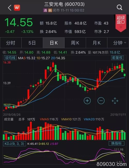 近期,三安光电股价在12元至16元之间波动,今日受大市影响收跌3.13%,报14.55元。