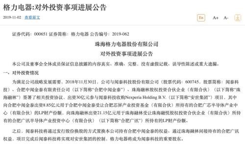 其中,格力向合肥中闻金泰有限责任公司出资8.85亿元,用于其受让合肥芯屏产业投资基金(有限合伙)所持有的合肥广芯半导体产业中心(有限合伙)的LP财产份额;向珠海融林股权投资合伙企业(有限合伙)出资21.15亿元,用于其受让珠海融悦股权投资合伙企业(有限合伙)所持有的合肥广讯半导体产业投资中心(有限合伙)所持有的LP财产份额。