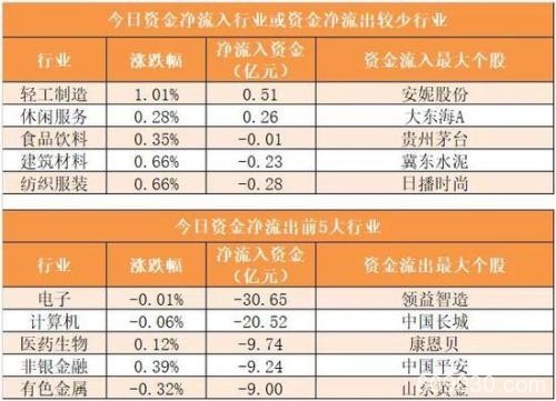 轻工制造行业净流入0.51亿元居首