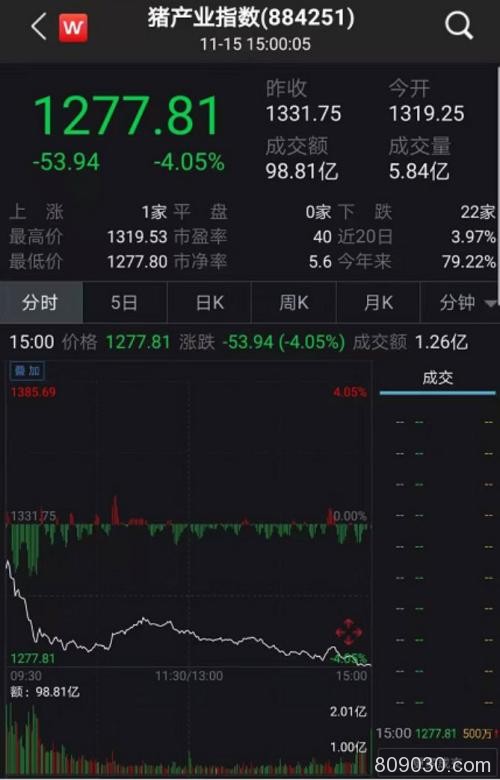 11月15日早盘,猪肉板块集体低开,猪产业指数大幅下跌,并一路走低。截至当日收盘,猪产业指数大跌4.05%,指数报收1277.81。