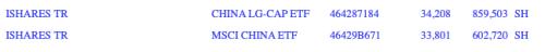 今年二季度,在MSCI纳入A股之后,桥水首次买入中国,新进ISHARES旗下两只中国ETF:持有中国大盘ETF约71.62万份,持仓市值3063.1万美元;持有MSCI中国ETF约50.04万份,持仓市值2974.6万美元。