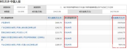 盘后龙虎榜数据显示,今日中国人保前五大卖出席位全部为机构席位,合计卖出金额超过10亿元,占今日总成交价的74%,其中两家机构席位卖出金额超过3亿元。而买入前五大席位全部是营业部席位,买入金额仅6314.36万元。