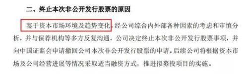 而就在证监会公开征求意见的当日,即2019年11月8日,(,)发布公告称,公司决定终止本次非公开发行股票事项,并向证监会申请撤回此次非公开发行股票申请材料。至于终止本次非公开发行股票的原因,公司也同样表示:“鉴于资本市场环境及趋势变化,经公司综合内外部各种因素的考虑和审慎分析,并与保荐机构等多方反复沟通,公司决定终止本次非公开发行股票事项,并向中国证监会申请撤回公司本次非公开发行股票的申请。”