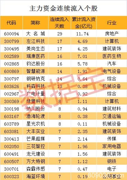 数据宝统计显示,截至11月20日收盘,共有68只个股主力资金连续5个交易日以上持续净流入,其中8股连续净流入10天以上。连续流入天数最多的是(,),该股已连续29个交易日净流入;连续净流入天数较多的还有(,)、(,)等,主力资金分别连续流入17天、17天。