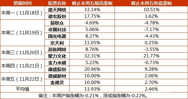 本周大盘先扬后抑,沪指涨0.21%,深成指涨0.22%。本周A股头条Z3精华版共挖掘12只个股,其中,截止本周五最高平均涨幅为13.93%,明显跑赢大盘。虽然本周大盘上蹿下跳,整体偏弱,但我们依然捕捉到一些机会。如周一挖掘的(,)两连板,周三一度一字涨停看未能封住;周三挖掘的(,)两连板,周五一度逼近涨停;周四挖掘的(,)当日涨停,周五一度触及涨停。