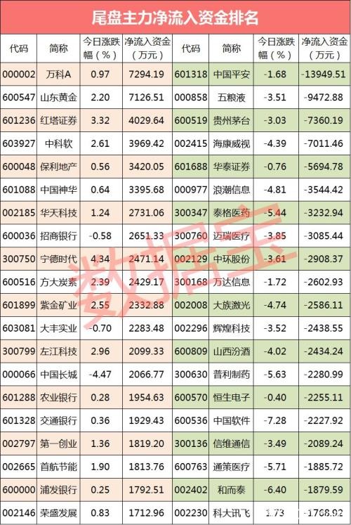 尾盘资金流入金额最高的是万科A、山东黄金,流入金额均超7000万元,(,)流入超4000万元。中国平安是唯一尾盘流出金额超亿元的个股,流出1.39亿元。五粮液、贵州茅台两只白酒龙头尾盘净流出9000余万元和7000余万元。