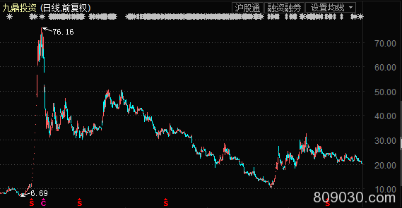除此之外,九鼎投资(行情600053,诊股)也算的上“鼎”字系妖股行情的半个老前辈了,为什么说半个?这要把时间倒回至2015年11月,当时备受冷落的江中集团地产平台弃子――中江地产凭借着九鼎投资百亿元借壳的消息,连拉15个涨停板(1个自然班+14个一字板),随后股价依旧强势上攻,在当年的12月21日创出历史新高76.16元,在2016年初才正式更名九鼎投资,但花无百日红,如今该股股价已经回到20元附近,年内累计涨幅为-12%左右。