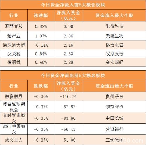 概念板块方面,周四聚酰亚胺、猪产业、港珠澳大桥、反关税等概念板块资金呈现净流入,其中聚酰亚胺概念净流入3.06亿元居首。