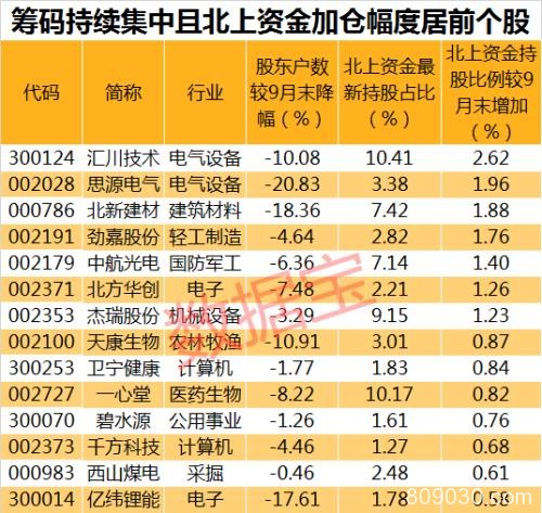 其中14股北上资金最新持股比例相较9月末增加超过0.5个百分点,汇川技术(行情300124,诊股)北上资金最新持股比例为10.41%,相较9月末持股比例增加2.62个百分点;思源电气的北上资金最新持股比例为3.38%,相较9月末增加1.96个百分点;其他增幅较大的还有北新建材、劲嘉股份(行情002191,诊股)、中航光电(行情002179,诊股)、北方华创(行情002371,诊股)和杰瑞股份(行情002353,诊股),增幅都超过1个百分点。