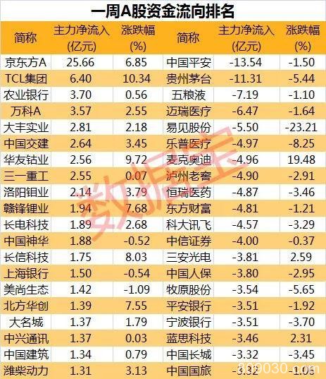 个股方面,本周共25股主力资金净流入超亿元。京东方A主力资金净流入25.66亿元,主力资金流入力度最大,该股本周上涨6.85%。TCL集团获主力资金净流入也有6.4亿元,本周上涨10.34%。这两家公司都是生产面板的行业头部公司,获主力资金净流入的面板企业还有深天马A(行情000050,诊股),净流入0.85亿元。
