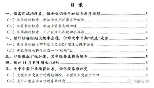 >>预计11月PPI约增长-1.6%左右,与上月持平。11月份原材料购进和出厂价格指数分别较上月下降1.4和0.7个百分点,预示11月工业生产者价格指数PPI上涨动能有所减弱,预计11月PPI同比增长-1.6%左右。