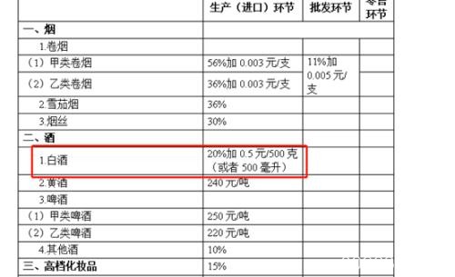 同时,受资本市场关注最热烈的白酒商品的征税,实际上并没有发生变化。根据公布的税目税率表,白酒在生产(进口)环节征税,税率为20%加0.5元/500克(或者500毫升)。