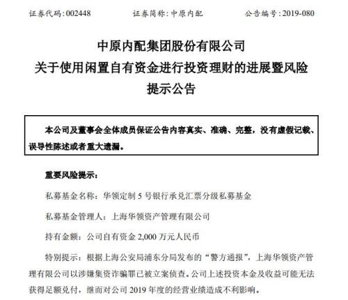 根据上海公安局浦东分局12月2日发布的“警方通报”,上海华领以涉嫌集资诈骗罪已被立案侦查。公司上述投资本金及收益可能无法获得足额兑付,继而对公司2019年度的经营业绩造成不利影响。证券时报・e公司记者注意到,中原内配此前还“踩雷”上海良卓,两次中招导致1.3亿元资金未能收回。