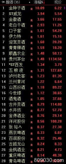 金种子酒(行情600199,诊股)开盘后迅速涨停、ST威龙(行情603779,诊股)、金徽酒(行情603919,诊股)、老白干酒(行情600559,诊股)涨幅超2%,贵州茅台(行情600519,诊股)、五粮液(行情000858,诊股)、酒鬼酒(行情000799,诊股)、泸州老窖(行情000568,诊股)等涨幅超1%。