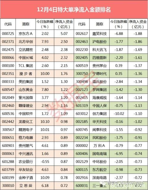具体到个股来看,11股特大单净流入超亿元,京东方A特大单净流入5.07亿元,净流入资金规模居首;北方华创(行情002371,诊股)特大单净流入资金2.50亿元,位列第二;净流入资金居前的还有立讯精密(行情002475,诊股)、中国长城(行情000066,诊股)、TCL集团(行情000100,诊股)等。特大单净流出股中,露笑科技(行情002617,诊股)特大单净流出资金1.88亿元,净流出资金最多;沪电股份(行情002463,诊股)、科大讯飞(行情002230,诊股)特大单净流出资金分别为1.86亿元、1.69亿元,净流出资金规模位列第二、第三。