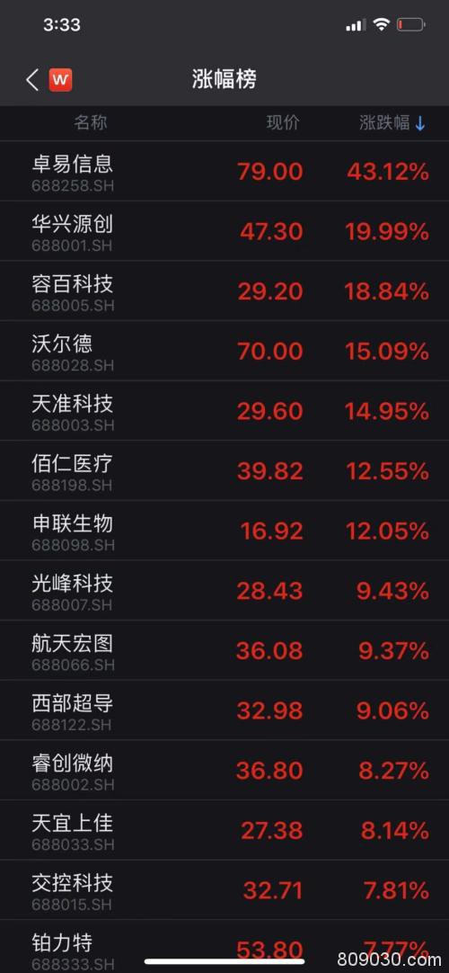 今日,科创板延续昨日的强势,个股普涨。截至收盘,卓易信息(行情688258,诊股)上涨43.13%,华兴源创(行情688001,诊股)连续第二个交易日报收涨停。容百科技(行情688005,诊股)、沃尔德(行情688028,诊股)、天准科技(行情688003,诊股)、佰仁医疗(行情688198,诊股)、申联生物(行情688098,诊股)涨幅逾10%,涨幅最小的中微公司(行情688012,诊股)也上涨了1.34%。63只科创板股票合计成交额176.83亿元,占沪市成交额的近10%。