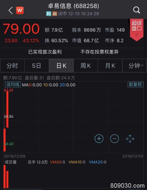 与昨日的开盘价相比,两个交易日,卓易信息上涨了92.68%,较发行价上涨了198.23%。两日大涨后,这家总股本不到8700万股的公司总市值已达到了68.70亿元。