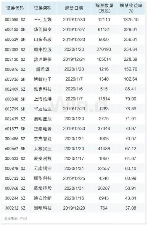此外,有部分定增解禁的股票也存在减持的压力。Wind数据显示,截止12月16日收盘,定增解禁的公司中,三七互娱(行情002555,诊股)、华创阳安(行情600155,诊股)、山东药玻(行情600529,诊股)、顺丰控股(行情002352,诊股)、韵达股份(行情002120,诊股)、新希望(行情000876,诊股)、博敏电子(行情603936,诊股)等7家公司解禁收益翻倍。