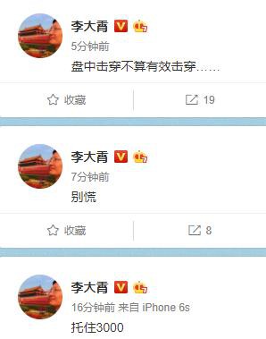 此前李大霄曾多次提出“A股永别3000点地平线”、“3000点已被焊牢”等观点。