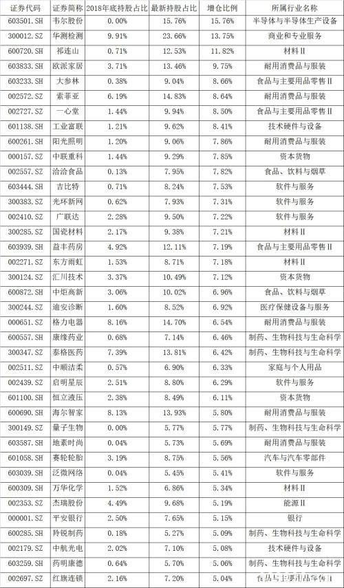 具体来看,韦尔股份(行情603501,诊股)增仓比例最为明显,最新持股比例为15.76%,全部为今年买入,去年北上资金并未持股。其次是华测检测(行情300012,诊股)、祁连山(行情600720,诊股),持股比例分别增加13.75个百分点和11.82个百分点。其中,华测检测的最新持股比例达23.66%,接近外资持股比例红线28%。