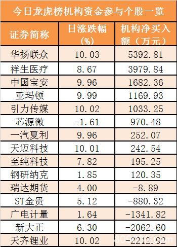 盘后龙虎榜数据显示,机构现身15股,其中华扬联众(行情603825,诊股)等10股呈现机构资金净买入,天齐锂业(行情002466,诊股)等5股呈现机构资金净卖出。