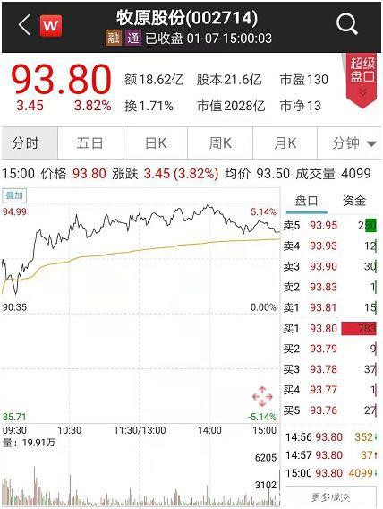 1月7日,牧原股份也出现了大涨行情,盘中股价大涨超5%以上。截至收盘,牧原股份报收93.80元,涨幅3.82%,市值2028亿元。