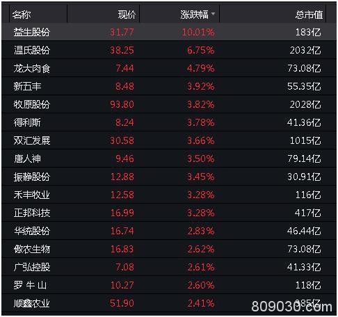 当天,板块内23只成分股全线飘红,益生股份(行情002458,诊股)涨停、温氏股份、龙大肉食(行情002726,诊股)、新五丰(行情600975,诊股)、牧原股份等猪肉股涨幅居前。