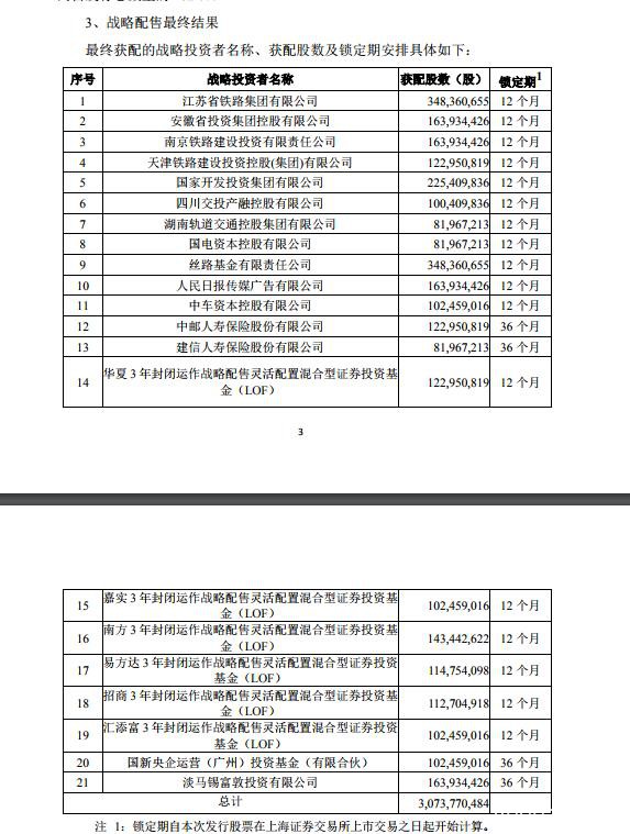 京沪高铁(行情601816,诊股)战略配售结果出炉,丝路基金、江苏省铁路集团各获配3.48亿股,安徽省投资集团获配1.64亿股,人民日报传媒获配1.64亿股;淡马锡富敦投资有限公司获配1.64亿股,锁定期36个月易方达、南方基金、汇添富、嘉实均有参与。