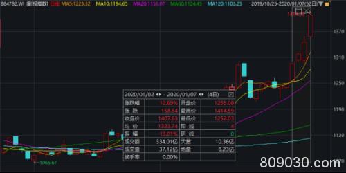 连续三年涨幅垫底的影视板块突然爆发,截止1月7日,影视指数已经上涨了12.69%。仅7日当天,影视指数盘中一度上涨超5%, 最终收在了1407.63,上涨4.66%。