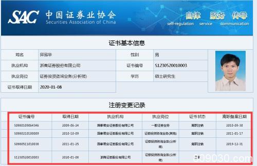 而基金君从中国证券业协会查询资料可知,邱冠华的确在2019年12月31日离职国泰君安,并于1月8日入职浙商证券。
